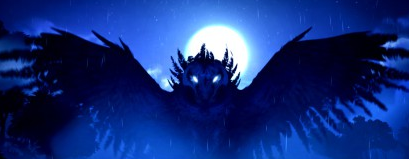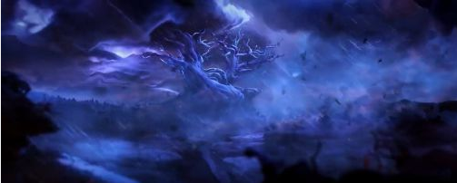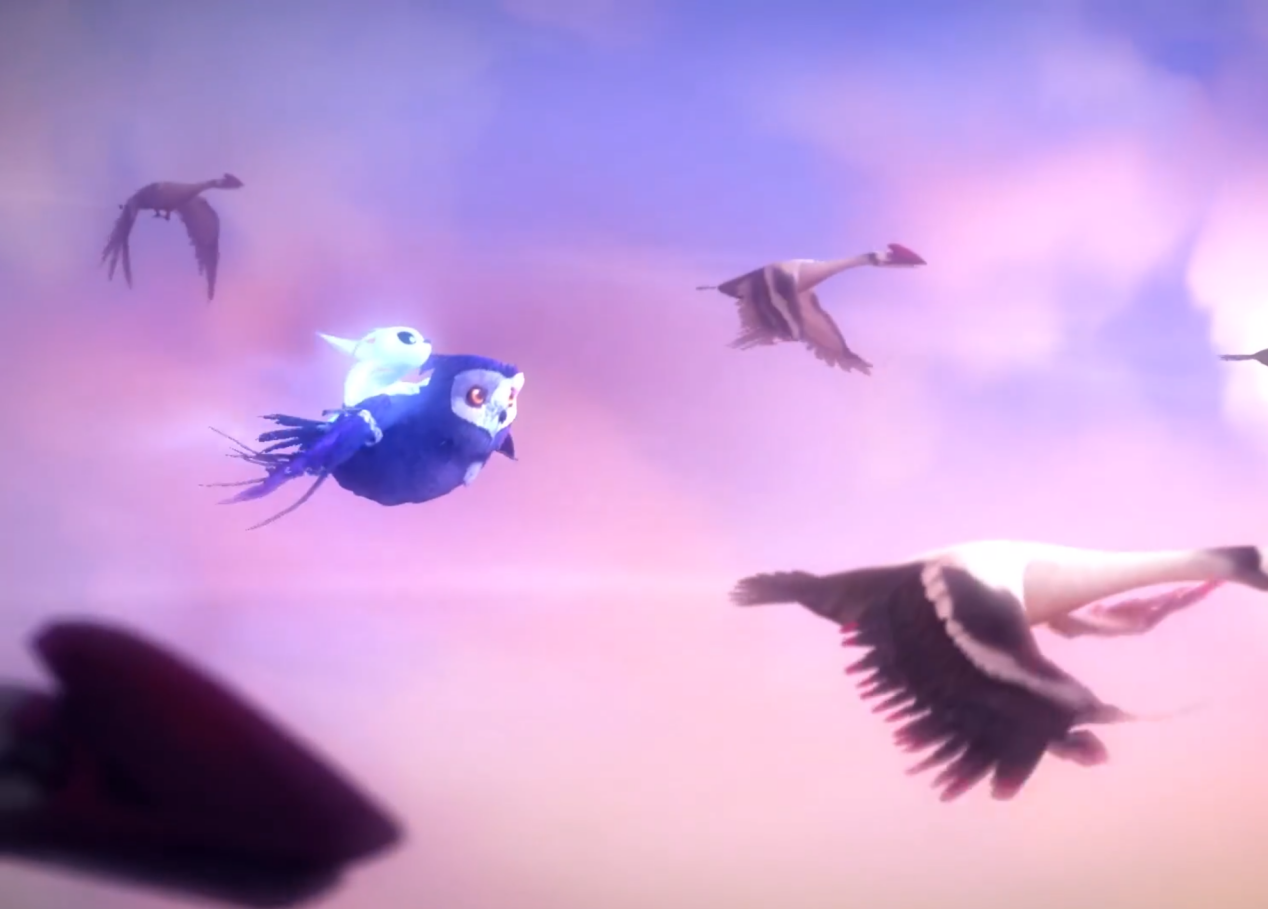 开场CG时从晴朗的天空突然转至雷暴气候,一时间,雷声大作,狂风骤雨随之袭来,在构图中心,小猫头鹰库和伏在其身上的奥日表情紧张,显得手足无措。两个小小的主角和阴云密布,充满阴霾色彩的天空形成了强烈反差感,瞬间就把人带入了场景之内,令玩家不住揪心。而在奥日历经磨难找到库之后,背景画面中两只相互依偎但已化为石雕的猫头鹰在构图最显眼处。这两只猫头鹰的雕像交代了一代BOSS黑子曾经的住处已经化为荒芜,猫头鹰们都被诅咒,成为了一个阴森恐怖的地方。此处场景阴冷的淡蓝色调配合淅淅沥沥的雨幕显得尤为震撼。而在夸洛克地穴,场景构图则以明亮的黄绿色进行搭配,光晕渲染出一副日落时分,沼泽静谧美好的画面,氛围之温馨尽在不言中。