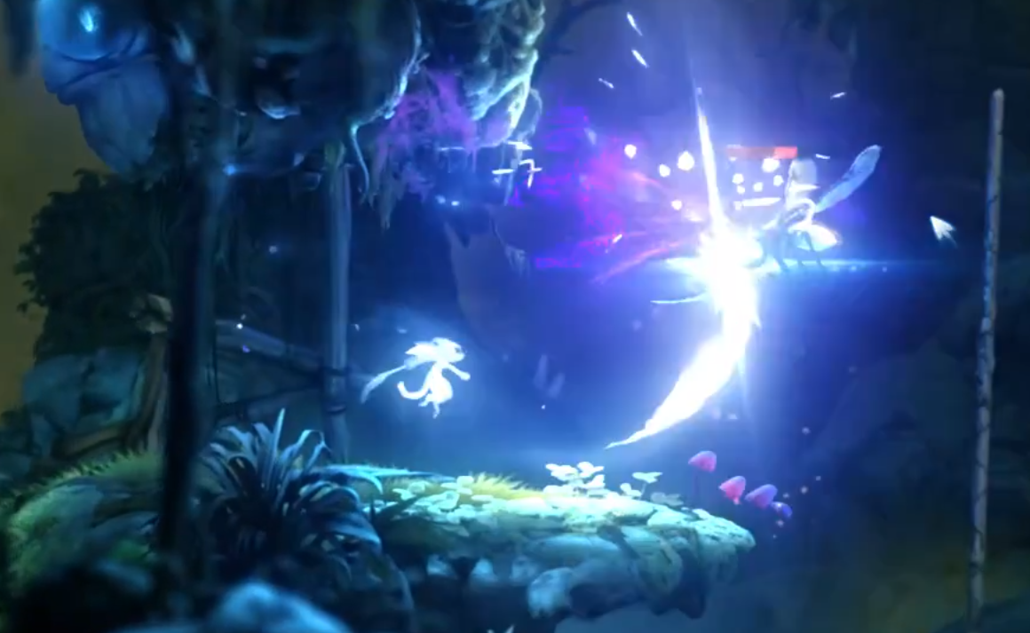 《奥日2》的战斗系统为本作的第三个亮点,作为横版过关游戏,战斗系统的自由度和丰富程度往往乏善可陈,前作《奥日1》就曾因此遭到诟病。而在《奥日2》中,战斗系统的完整程度着实令人惊叹。即便是在和小怪战斗时,奥日的三段跳跃,一段冲刺配合上光剑,大锤,弓箭,光矛等武器的搭配,使得玩家有上天入地,无限连击的快感,甚至一度产生在玩《鬼泣五》类型的ACT游戏,在空中灵巧翻转的同时,打击感也是非常过瘾。