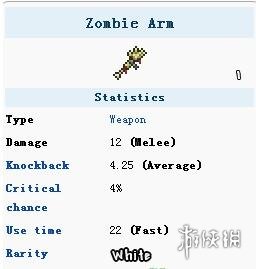 僵尸手臂在杀死各类僵尸时有0.4%的几率获得,相当于一把钨制宽刃剑,只是范围较小,是早期的一个优秀武器。