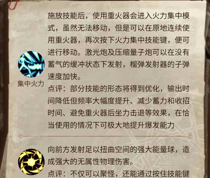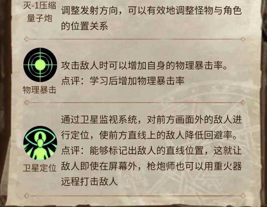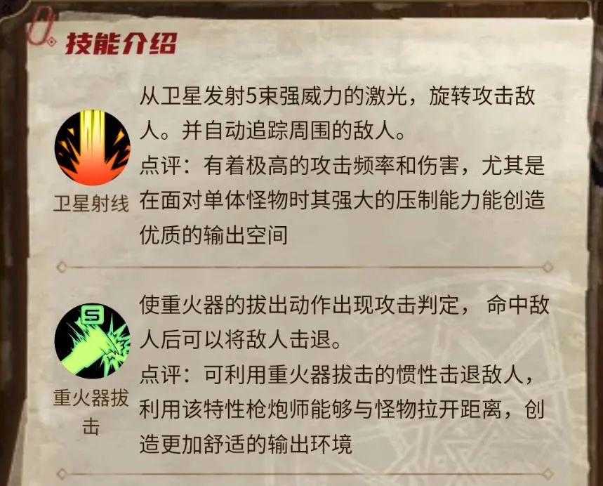 枪炮师是爆发输出职业,推荐强化物理攻击力、力量,属性强化选择光属性或火属性,攻击距离较远,基本所有技能都有属性攻击,但需要在输出时和敌人保持距离,否则无法命中。上手难度较低,决斗也强力,但需投入较多资源。