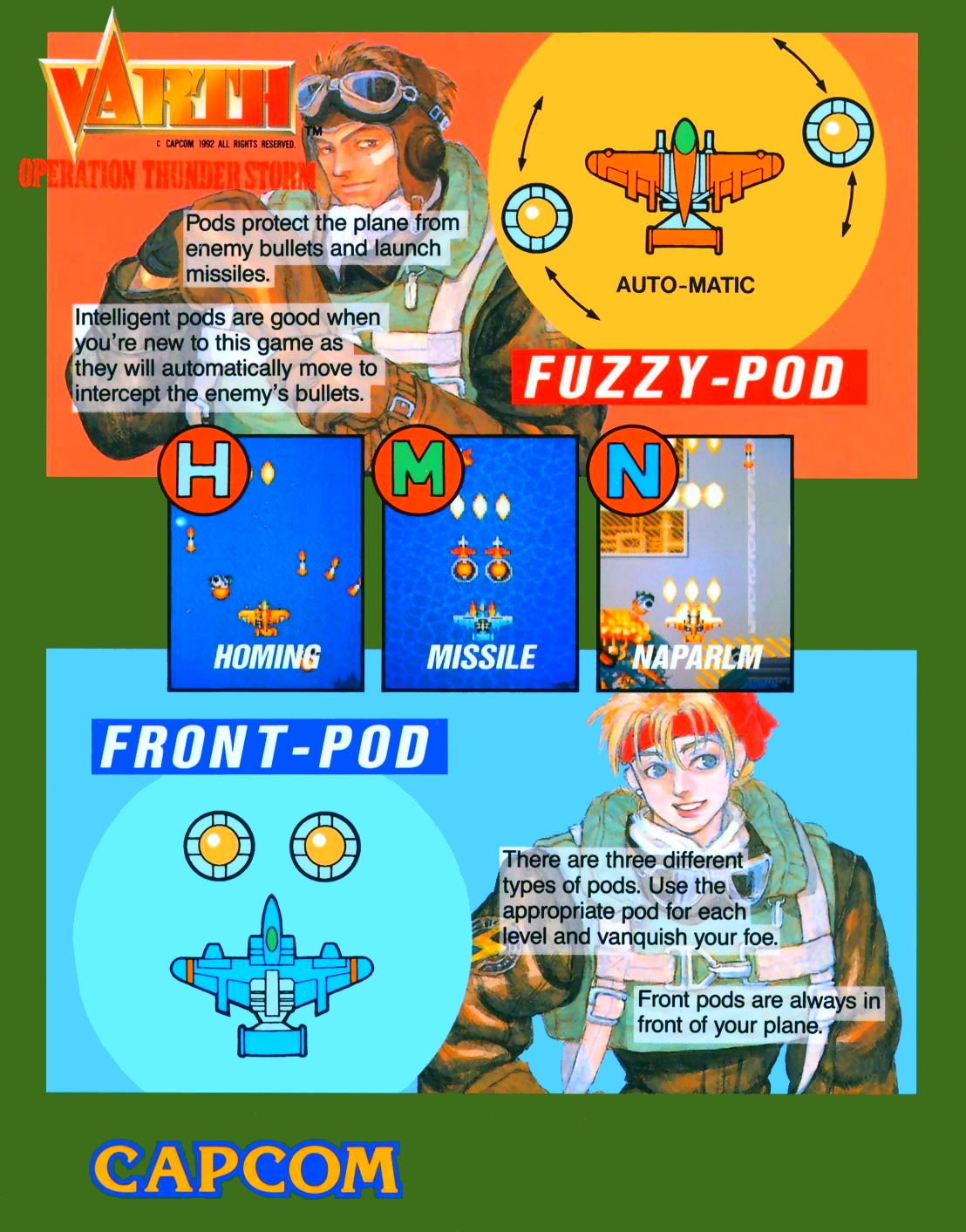 游戏一开始有两架飞机可以选择,FUZZY-POD是男性驾驶员,辅机是围绕飞机活动的;而FRONT-POD则是美女驾驶员,辅机是阻挡在飞机之前的。当年大部分玩家选择的都是女性驾驶员,因为只要挡住了前面的子弹,玩家就可以为所欲为了。