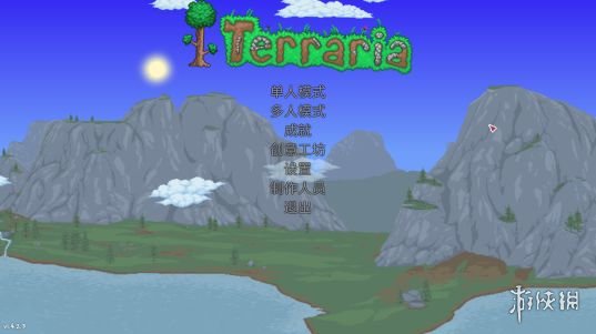首先我们打开游戏,映入眼帘的依然是这个熟悉的游戏主界面。不同以往的是这次的泰拉瑞亚有了线上的功能,玩家可以在线上社区做到联机,浏览版本资讯与攻略,以及下载线上地图等。