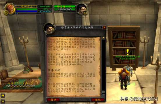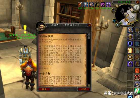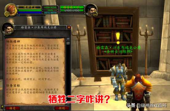 来到暴风城的大教堂左侧小房间内,找到格雷森公爵交任务。公爵要求玩家首先展示自己的牺牲和公正……主要是牺牲。具体就是带上150个金币,到铁炉堡去找高阶牧师洛汉,先捐款再获得驱魔香炉。嗯,的确是牺牲精神……