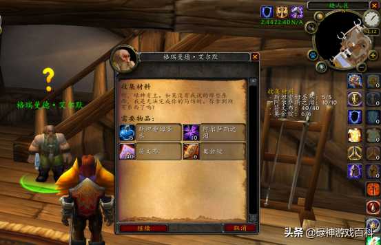 艾尔默呆在矮人区左上角运河边上的小房间里,当初“雷矛的包裹”任务也是他给的。这位大师铁匠要求玩家给他40块符文布、6块奥金锭、10棵阿尔萨斯之泪、5瓶斯坦索姆圣水和150金币。嗯,收金币的名目是劳务费……