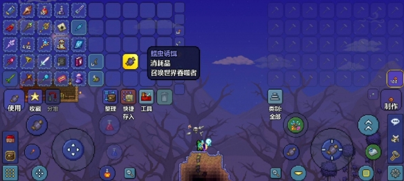 黑长直(世界吞噬者)需要玩家在腐蚀之地使用蠕虫诱饵进行召唤。蠕虫诱饵的的制作方式是15个腐肉加上30个恶毒毒粉在恶魔祭坛合成。