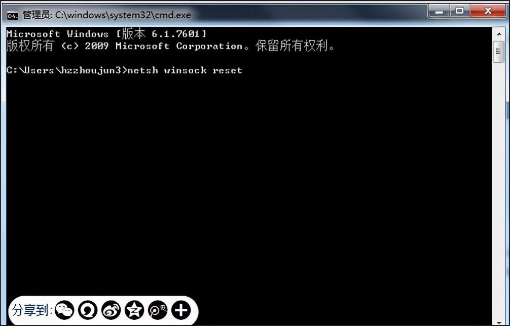 二、如果不行您可以运行【CMD】,输入【netsh winsock reset】指令后重启计算机登陆,利用该程序下次就不会卡在加速界面啦。