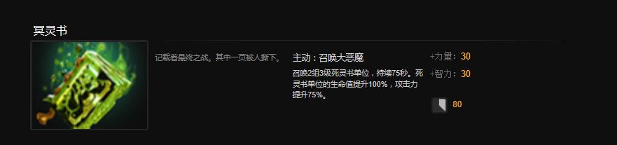 从物品介绍中可以看到,这件中立道具所提供的30点力量与30点智力还是挺香的,而它的主动技能所召唤的2组3级死灵书单位(持续75秒,死灵书单位的生命值提升100%,攻击力提升75%)无论是用于分摊诸如无敌斩、月蚀这样的AOE伤害还是用于探路、反眼都是相当实用的。但问题就在于这是一件第5级的中立道具,也就是说要想获得它就必须得满足当局游戏时间超过60分钟这个前提,如果是放到60分钟的大后期来看的话这件道具的属性和主动技能其实也就那么回事了。