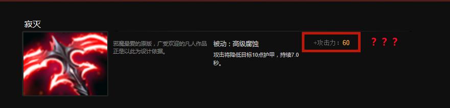 在黯灭获得增强的情况下,效果与黯灭类似的寂灭却并没有得到增强,它依旧是一件提供60点攻击力并减少敌方10点护甲(持续7秒)的5级中立道具,更关键的是黯灭是一件十几二十分钟就能掏出来的道具,而它则是一件60分钟以后打野怪才有概率掉落的道具,就个人一种被官方遗忘掉的感觉好吧!