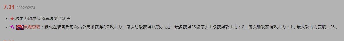 在7.31版本中黯灭这一道具可谓是获得了一个相当大的加强了,在鼓励打快节奏的版本中这件道具(减少敌方6点护甲持续时间7秒,攻击力加成从55点减少至50点,现在带有腐蚀效果的敌方英雄阵亡后将获得+2点攻击力,最多25点)在出得早且打架频繁的情况下最多是能够增加75点攻击力的,因此在7.31新版本中玩家们也是将这件前中期滚雪球能力较强的道具戏称为了“杀人刀”。