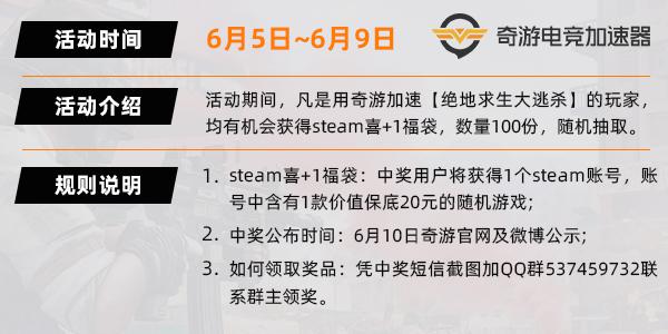 《绝地求生》免费游玩期间,奇游电竞加速器特面向所有玩家开启限时福利活动,下载奇游客户端、加速畅玩《绝地求生》,即有机会获得Steam喜+1福袋,活动规则请见图。