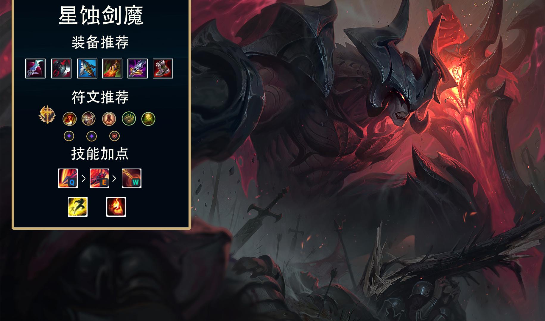 之前几个版本星蚀剑魔就已经有逐步成为主流的趋势,而现在韩服主流剑魔已经是彻底放弃咳血选择星蚀为主要核心。为什么会存在这种情况呢?很简单,就是因为之前的全防御补丁上线,每个英雄都获得了坦度提升。之前英雄坦克适中或者偏低,不需要任何破甲属性的咳血也能打得动大部分英雄,但因为坦度都提升了,剑魔再出咳血已经出现伤害严重不足的情况,而剑魔是那种需要打出高伤害才能保证高续航的英雄,而有珍稀属性全能吸血且带穿甲属性的星蚀慢慢就受更多的剑魔玩家所青睐。核心装备星蚀+黑切+冰刀,最后两件大部分情况都是死舞+饮魔刀的战士两件套提高容错率。符文选择依然是征服者保证持续作战能力,加点上主Q副E,召唤师技能推荐点燃提高斩杀能力。打法是利用的高穿甲和破甲属性去保证足够输出,靠高伤害提升回复量。