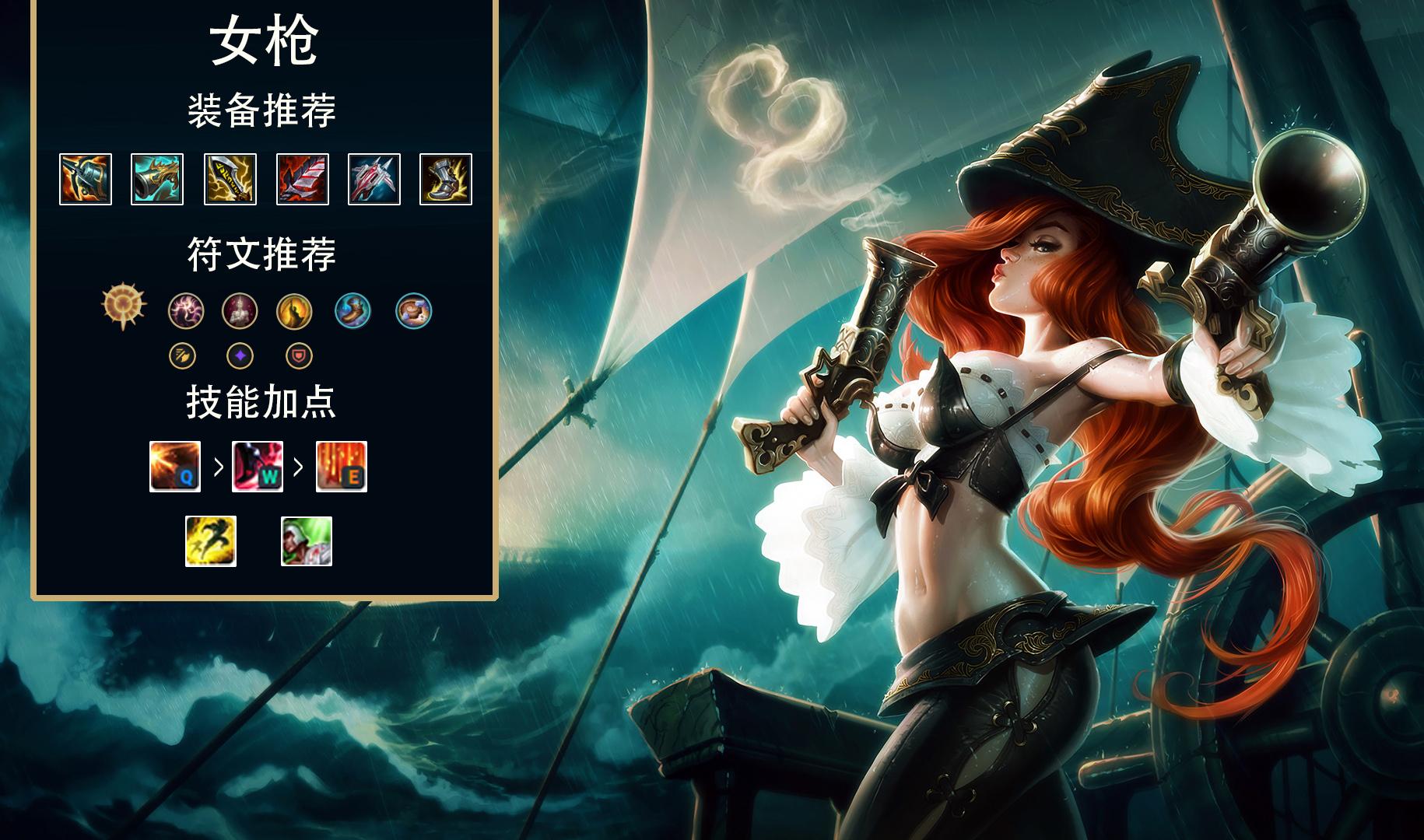 Q技能加强而在E技能的CD延长了数秒后,主流打法的女枪已经放弃了前期提升E技能的彗星打法,进而选择主Q的强攻打法,目的是配合AQA快速触发强攻打爆发配合传统暴击装备打更高的持续输出。装备核心海妖+收集者+无尽,最后两件选择破甲弓最大化破甲收益,饮血剑保证续航。符文选择强攻,小符文气定神闲和饼干必点,由于出装上没有任何蓝量加成的装备,而且实战中女枪很耗蓝,这两个小符文保证大部分情况下不缺蓝。技能加点主Q副W,召唤师技能选择传统AD的治疗即可。打法上平时持续输出打走A,关键团战靠ER打团体爆发,简单暴力。