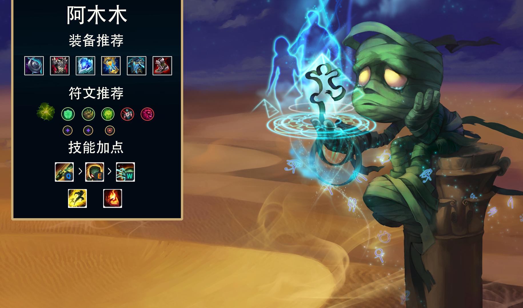 一个在韩服已经强势了数个版本的阿木木,在国服却鲜有玩家去玩。阿木木作为克制AD类英雄的克星,在之前的版本Q技能改成有两段后阿木木在辅助的强度就直接上升到了T1,直接提升了阿木木的粘人能力,有了更多试错的机会。核心装备薄暮法袍+反甲,后续装备推荐冰心配合E克制平A输出,自然之力克制AP并提升移速,金身方便阿木木进场开团后有规避伤害的上限。符文选择余震,触发后的双抗更耐抗,小符文终极猎人必点,为了有更短的R方便能打出更多的团控。技能加点主Q副E,召唤师技能推荐点燃,阿木木经常会出现缺少伤害的情况,带上点燃能保证击杀。打法上可以看到出装除了自然之力外全是加护甲的,打的就是硬,硬抗伤害硬开团,由于阿木木属于陷阵型坦克,Q上去基本除非坦克上来了,不然很多时候都是有去无回,所以需要队友会配合跟上,这也是为什么国服阿木木少的原因。