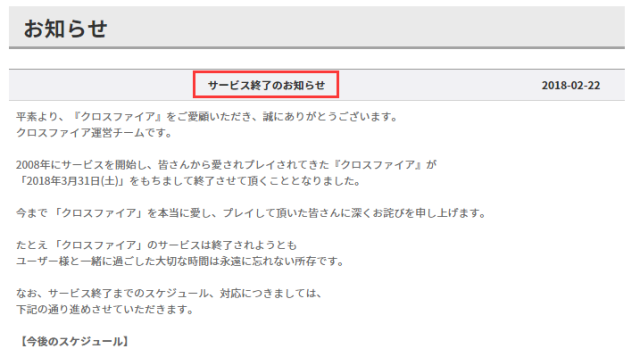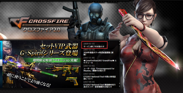 非常感谢您继续赞助“Cross Fire”。我们是CF团队。“CF”创始于2008年,深受大家的喜爱与支持。但它即将于于2018年3月31日(星期六)结束了。我们很喜欢CF,我想深深地向所有的玩家道歉。