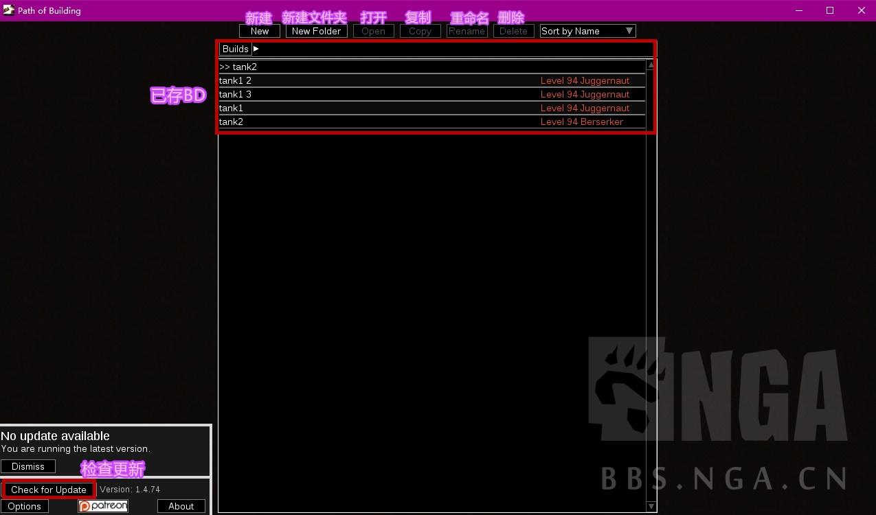 而在左下角是程序选项,还有检查更新。一般会自动检查更新,来确保软件能跟上版本。POB的更新非常的快,并且会很快就修正各种BUG。