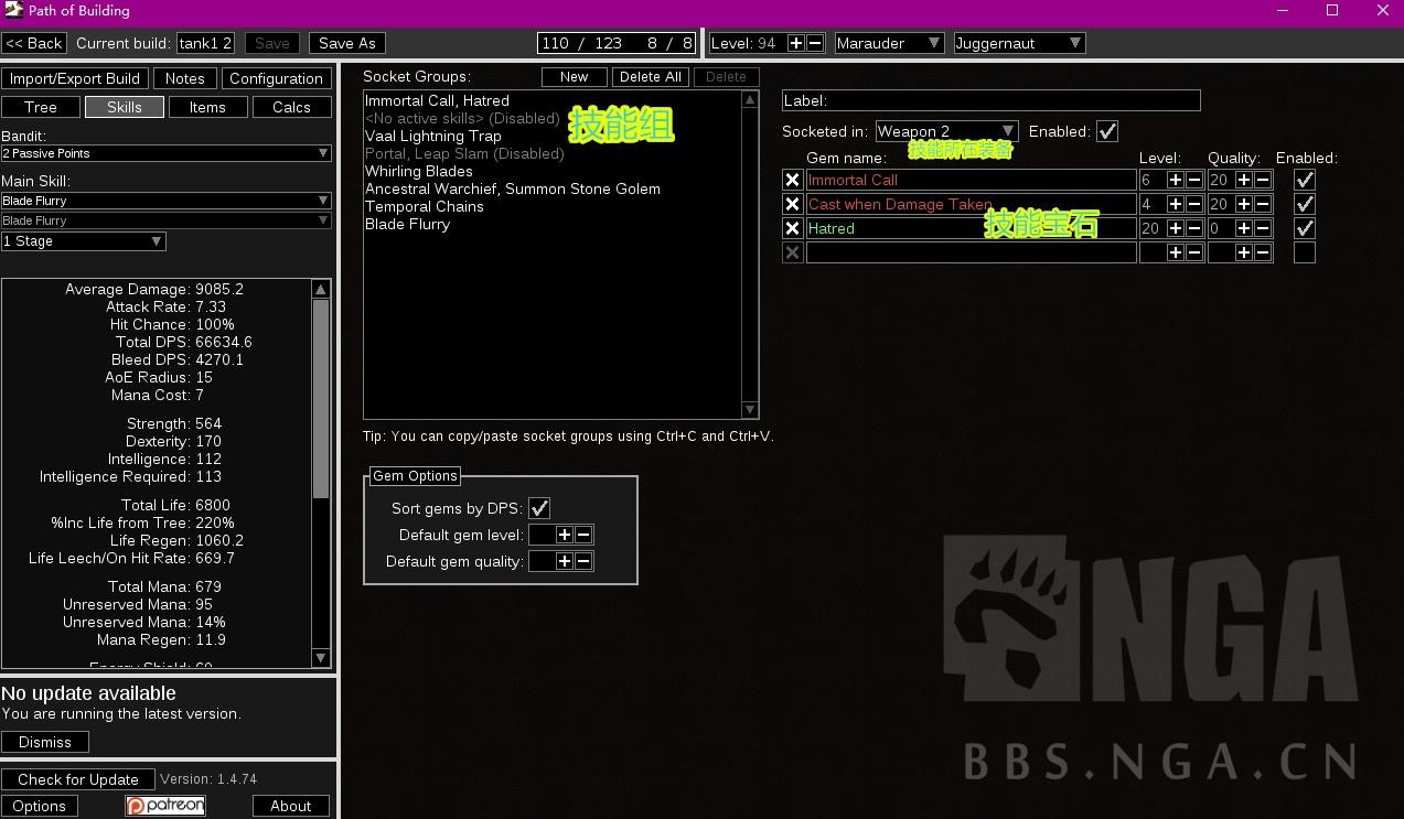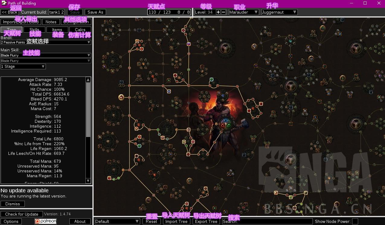 进入后就是BD页面,一开始基本都是在Tree天赋页。右边主要的窗口都是天赋,然后在左边就是一些选项。包括导入导出BD,做笔记,其他选项。天赋页,技能页,装备物品页,伤害计算页。