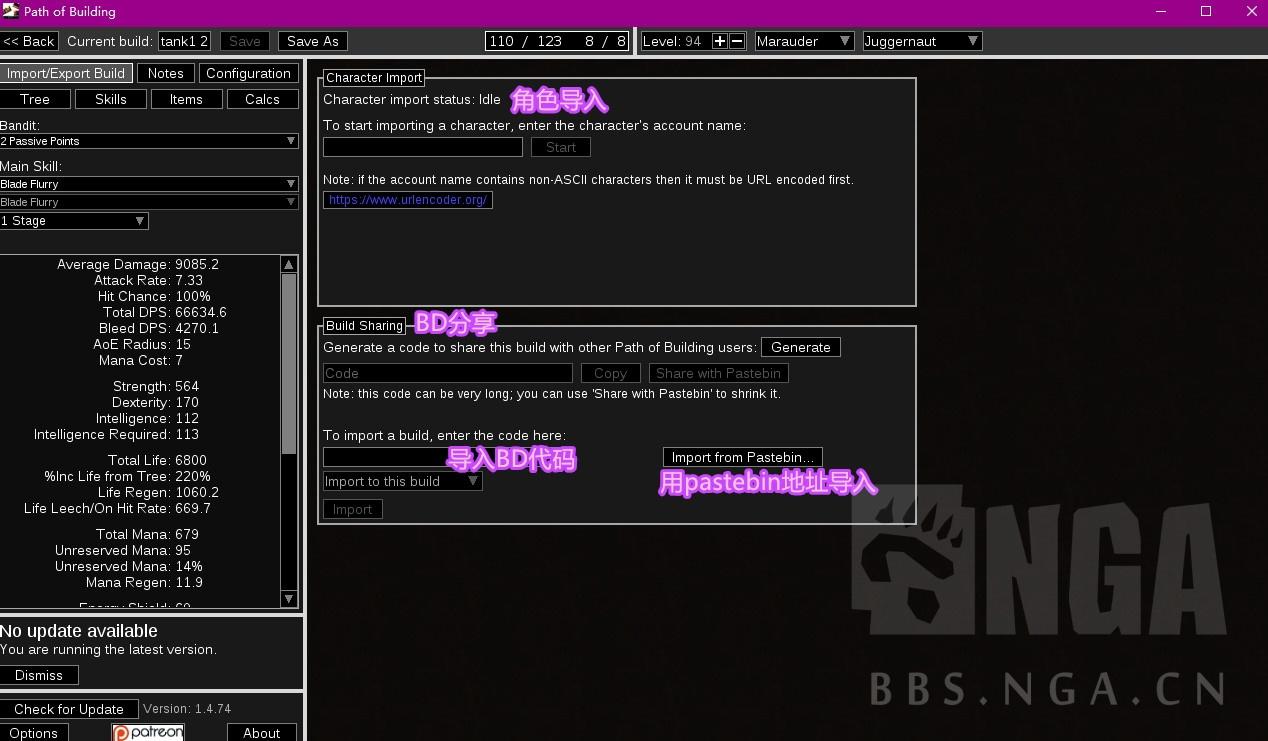 导入导出BD,我们经常会看到很多的BD攻略会留一个pastebin地址,或者是POB字符串,也就是用来导入的。上面是角色的导入,可以搜索,但是国服没用。下面就是导入,导入BD代码和pastebin地址导入,二选一即可。pastebin地址导入有时候会比较慢。