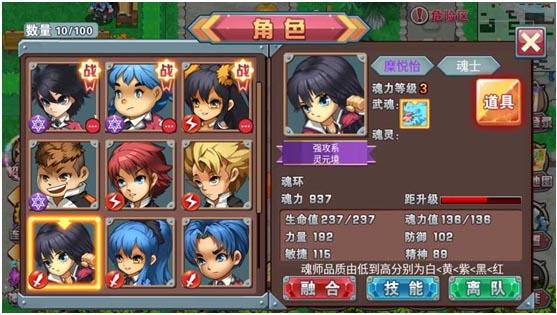 5、武魂游戏中武魂有近百个,由于相性问题不是所有的都能进行融合,基本上每个武魂都能融合十到二十个左右(也许更多点——),通过图鉴可以看到每个武魂可融合的魂灵;融合魂灵还需要有足够的精神力,一般不管几星的魂灵,十年、百年的基本上大多数人都可以融合,高星千年的就需要一些精神力高的角色才能融合获得方式和魂师一样也可以通过抽卡的形式随机获得6、角色类型游戏中的角色分为:强攻系、敏攻系、控制系、辅助系、防御系五种类型,对应的力量、敏捷、精神、魂力、防御几项属性优势。合理的搭配才能愉快地玩耍。