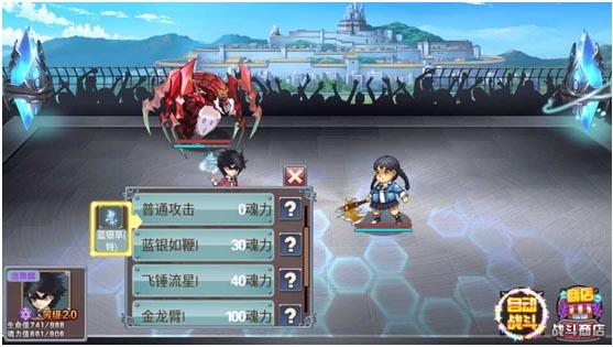 3、战斗踩地雷的遇敌方式(注意在右上角会提示危险区和安全区),战斗时玩家需要按行动顺序指派每个角色的动作。点击技能按钮,之后选择普攻、技能或防御。普攻和防御不会消耗魂力值,但使用技能会消耗相应的魂力,一些强力技能会消耗大量魂力。有些技能可以给自己或敌人加buff,比如缠绕:造成伤害(-1也是伤害)的同时有几率限制敌人行动。具体效果可以按住技能右侧的问号按钮查看。快没血了怎么办?没有魂力了怎么办?用道具啊(技能右侧按钮)!道具用完了怎么办?赶紧逛商店呀(右下角战斗商店按钮)!没钱买了怎么办?那就逃跑吧(道具右侧按钮)。碰上不能逃跑得怎么办?那你死定了……地图中遍布可挑战的魂师(头上顶着两把刀),能打赢他们的话……算你厉害!当然打赢后奖励也是大大滴。要是对自己有信心(即便平A都能赢的那种)可以开自动战斗,省的一遍遍的选择行动。要是没信心就老老实实的点吧。