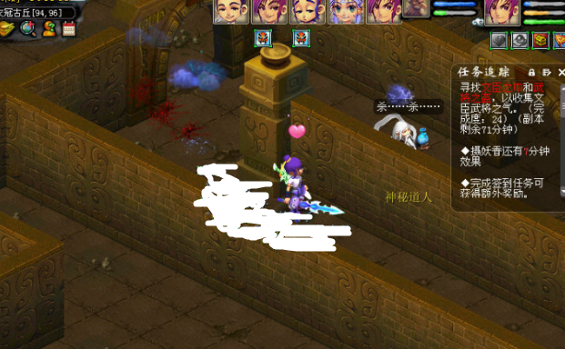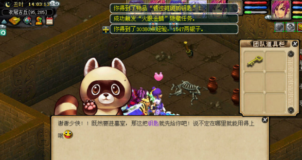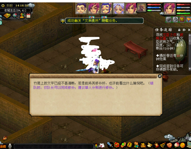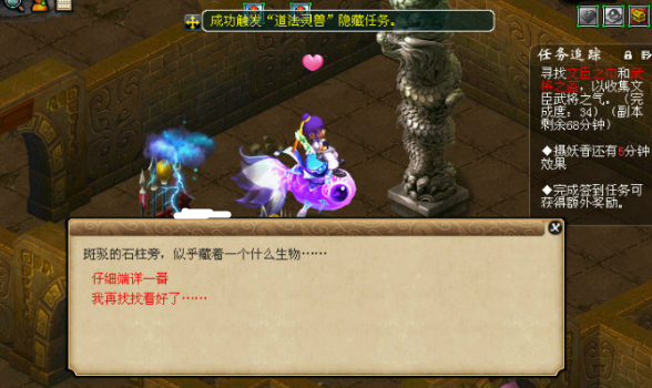 杀完老道,到石板所在房间,下方找到入口,进入房间(编号12),看到神秘石柱,点击触发“道法灵兽”隐藏任务