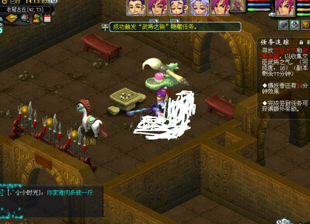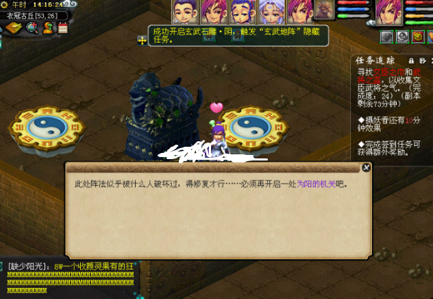 杀完后点剩下的马精或者笔精,完成任务。从左侧进入“玄武石雕 阴”所在的房间(编号6),点击触发“玄武地阵”隐藏任务