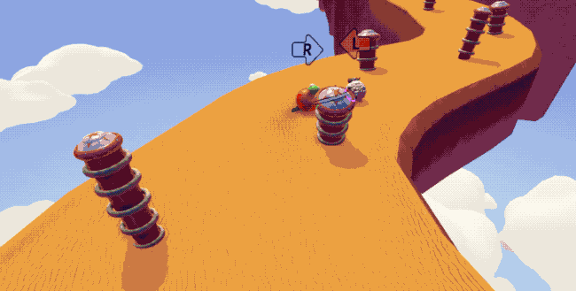 当然,游戏不止是只支持双人游玩,双人游玩只是控制一组(当然也可以两人作为对手,一人控制一组)。游戏最多支持四组进行比赛,而如果你控制器够多,屏幕足够大,地方也足够大,游戏可以最多8个人本地进行比赛,那欢脱的氛围可想而知。顺带一提,如果没有手柄两名玩家也可以使用同一键盘游玩,而如果觉得键盘又太小,又可以一人控制鼠标、一人控制键盘来控制同一组。不过个人感觉,还是两个人同握一个手柄的体验更能体现出这款游戏设计的“巧妙”之处。
