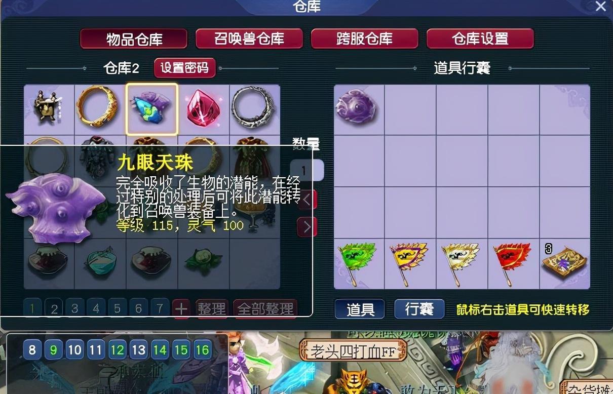 上面这位玩家的仓库中就放着一个115级满灵气的九眼天珠,这种九眼天珠打造召唤兽装备的时候是有可能会打造出那种增加了88伤害的召唤兽装备的,可以卖到大几千块,但是犀牛感觉获得了满灵气的九眼天珠后不要打造,卖掉才是最正确的选择,因为打造出高属性的可能性比较低,很可能会打造出增加垃圾属性的装备。