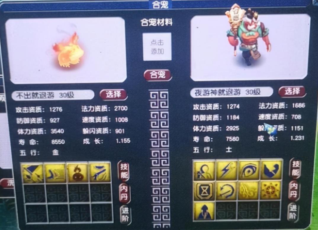 上面的这组炼妖比较特殊,上面的这组炼妖使用的胚子中有一只召唤兽是火月蛙,火月蛙是需要通过炼妖才能够获得的特殊造型,现在这只火月蛙就有四个技能,另外一只召唤兽是拥有九个技能日游神,火月蛙打掉了一个必带,也就是上面的这组炼妖能够合出来的召唤兽的技能数量上限能够达到14个技能。