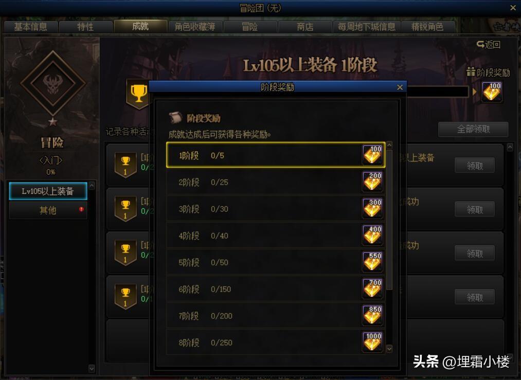 在冒险团成就中的冒险- [Lv105以上装备]标签页,阶段奖励可以获取大量金绿柱石。