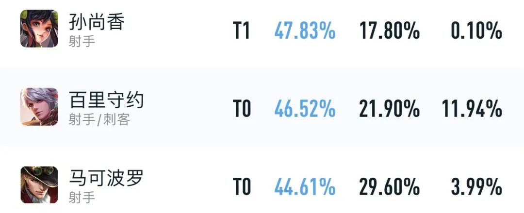 孙尚香是前几个赛季的射手一姐,强度跟公孙离不分上下,直到S28赛季初的横来一刀,使得她的胜率有较为明显的下滑,仅比马可波罗和百里守约好一些。