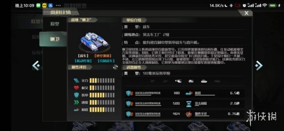 侧卫是联盟军战锤的改造体,它优化了侧卫对空不足的弱点,在中期的时候不再惧怕反抗军的直升机。侧卫提升了移动速度和射程,在操作的时候它的手感更好非常适合玩家进行微操和多线操作。侧卫的不足之处是它的耐久遭到了削弱,但是在大神玩家的手中,利用它的高移速和远射程可以让对面的重火力无法贴近侧卫,从而达到一个远距风筝的效果。