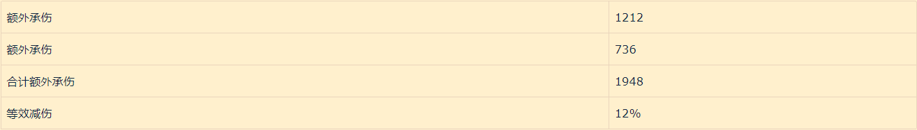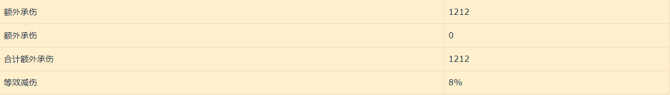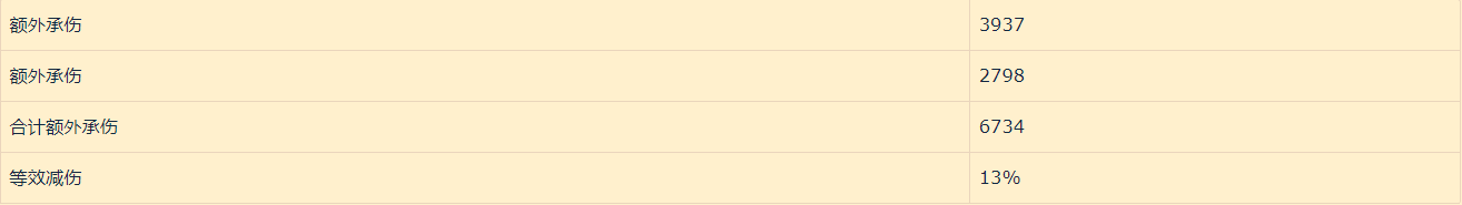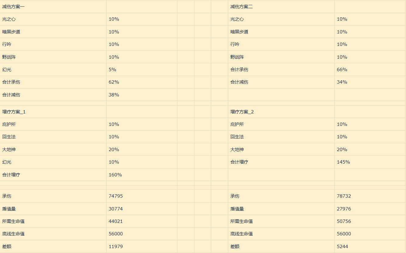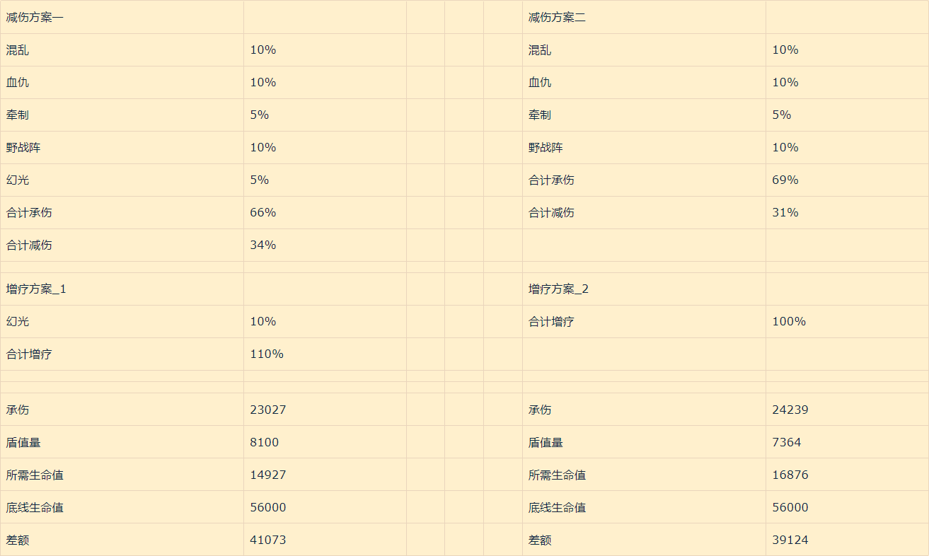根据以上减伤方案,我们可以看出,方案二对比方案一虽然能够吃下伤害,但是血线已经接近极限减伤值,根据计算我们可以得出以下数据。