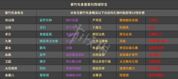 紫竹化身的好感可以通过赠送礼物来提高,他们最喜爱西域珍宝,赠送礼物时能获得10倍好感。
