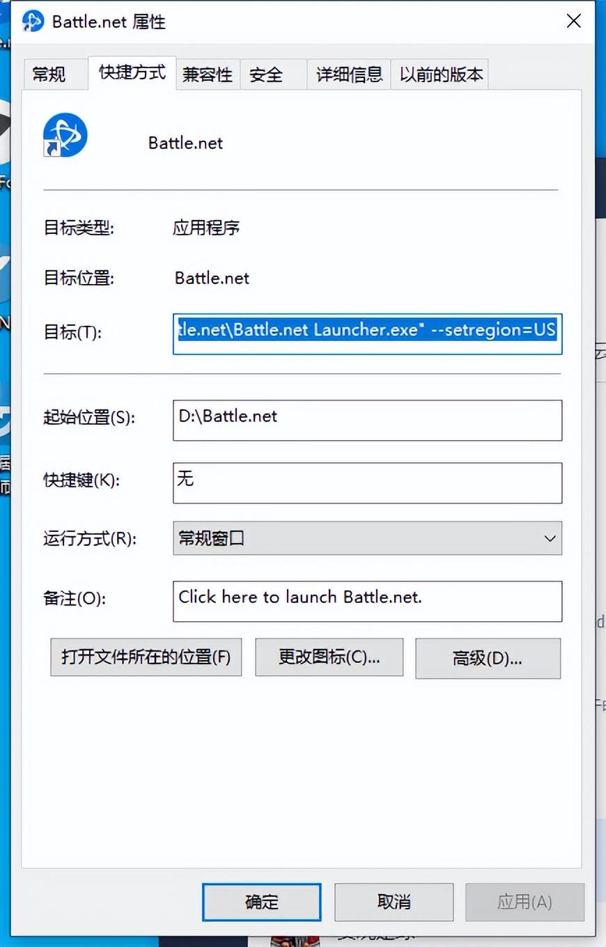 2.安装完成后,先别急着打开。右键你的战网图标找到“属性”,在目标位置的(t)后面,键入空格键--setregion=US(如下图),这样国服战网就能改为美服了。