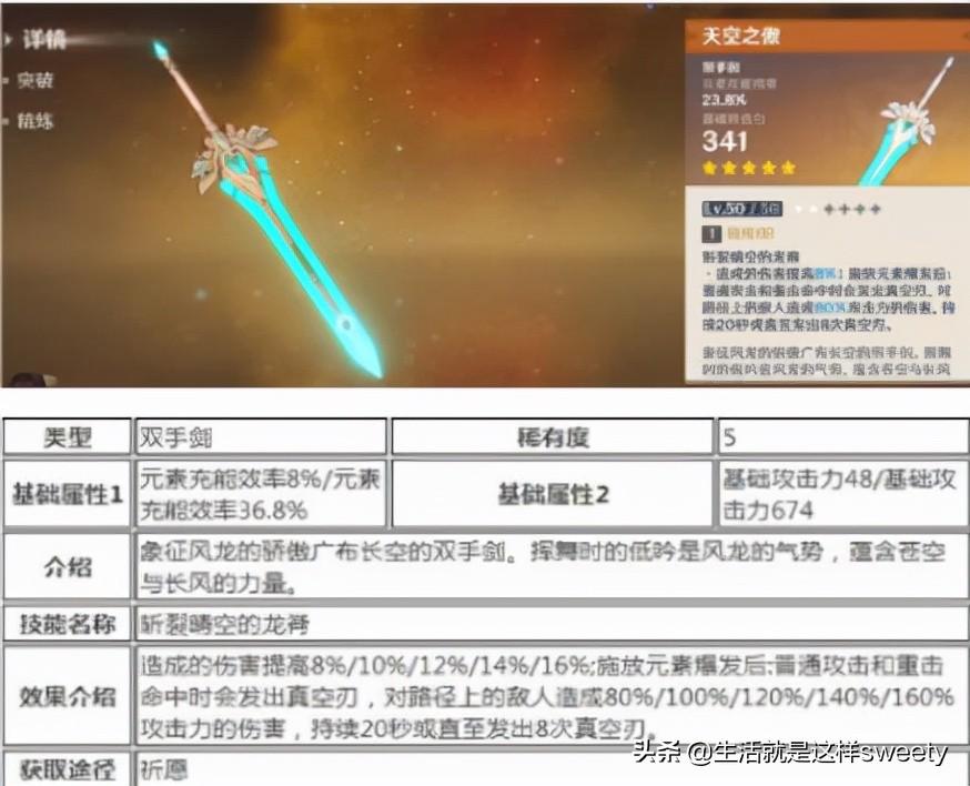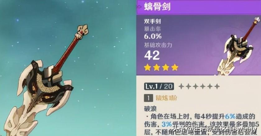 推荐度:SS (基础攻击在5星中属于一般般,副词缀攻击加成提供大量绿字攻击,被动提升攻击加成,攻击生命低于30%怪物可以给全队增加攻击加成!!攻击之王,老爷自身突破带暴击,因此及时武器中不含有双爆,圣遗物上来自双爆的压力也不会太高)