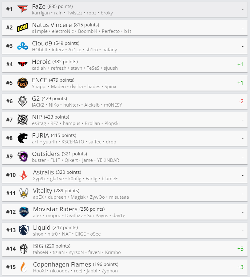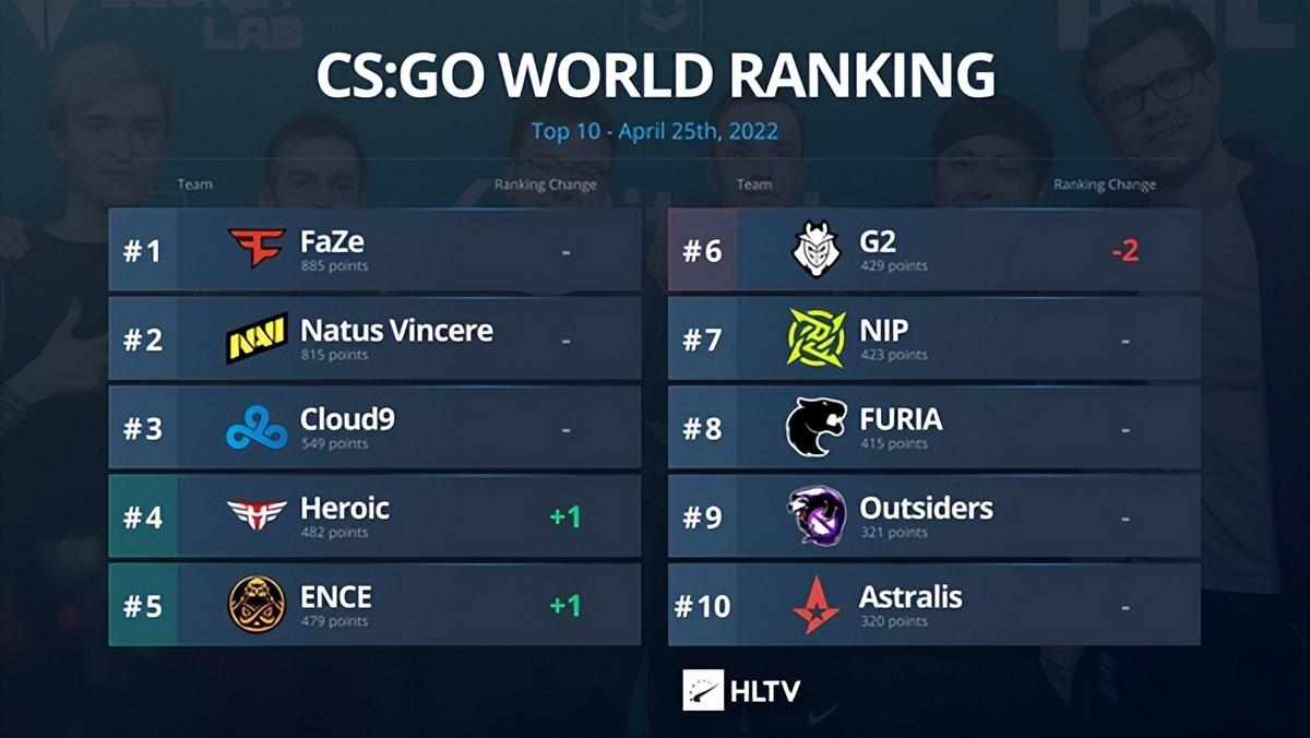 前十唯一的变化来自Heroic和ENCE,他们各提升一位,将G2挤出了前五的位置。