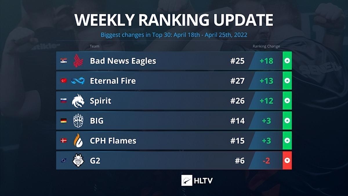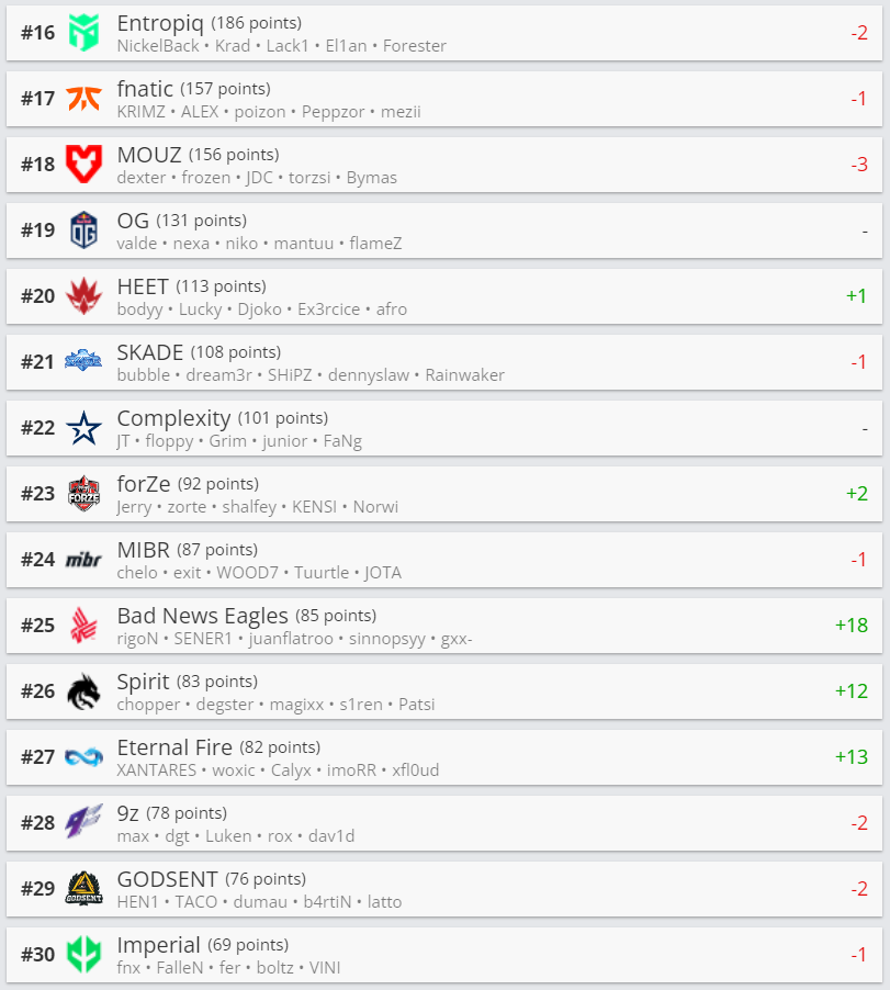 数支队伍在RMR期间表现出色,BNE、Eternal Fire皆首次进入Major,Spirit的新阵容也打出了令人满意的效果,他们分别来到第25、27、26位。BIG和CPH Flames得到了传奇组席位,排名皆上涨3位。