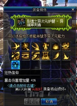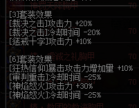 狂热信仰:25级技能,精通10级,上限20级。通过狂热信仰增加物理暴击率和物理暴击伤害,每增加一级狂热信仰可增加2%的物理暴击伤害量,1%的物理暴击率,10级精通是物理暴击率为10%,物理暴击伤害增加率为40%。20级狂热信仰可增加20%物理暴击率,60%物理暴击伤害增加率