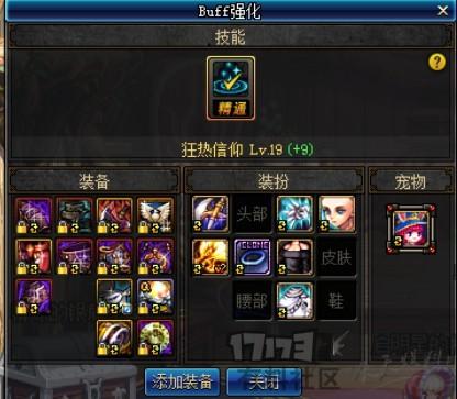 辅助装备:时间旅行者的怀表lv+1(深渊获得),尼泊尔中将的军衔lv+1,王室之秘籍-神焰处刑官狂热信仰lv+1时装上衣狂热信仰技能lv+1