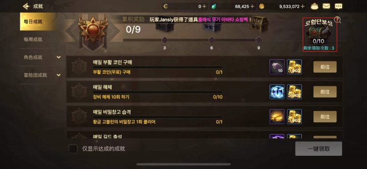 勇气币:属于活动代币,而且是账号通用的。有专门的活动商店,目前可以兑换的物品有光环,称号,泰拉,神器灵魂,卡片宝箱等等。每次通关地下城会掉落一枚,以及活动期间每个角色每天可以通关一次特典地下城(就是你的导师带你刷的,爆很多勇气币的图)。是肝帝主要的收益货币,角色越多,收益越高。 前期每天做的事情,刷完3个角色的疲劳,做完每日活跃,打特典地下城。 每日活跃入口如下 账号内角色活跃点数每累计10点,可以领取一次1000泰拉宝箱,每日3次。