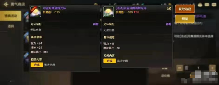 而且勇气币还有剩余的,可以攒起来兑换活动光环,称号,属性都不错的。光环,称号对比如下(左边是商城版,右边是兑换的免费版。)