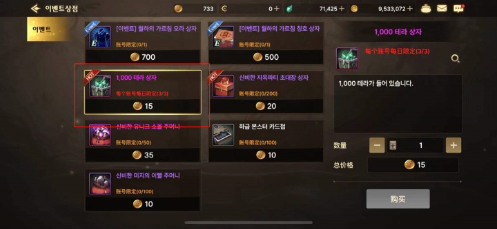 勇气币商店入口,点击图标,第一个商店就是。每15勇气币可以购买1000泰拉币宝箱,每日限购三次。