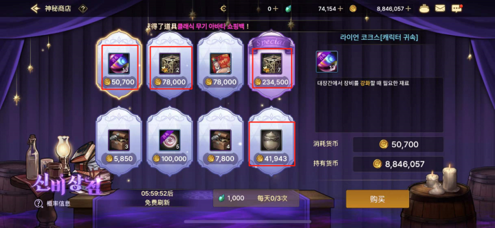 3.前期不要使用泰拉,金币,等珍贵资源,满级之后根本不够用,不要乱逛拍卖行,也不要随意强化装备。前期唯一需要消耗的, 就是你每5级,去制作一把同等 级的紫色武器即可。这样你的刷图伤害就能跟上了。另外大妈的每天的随机商店,建议只买徽章礼盒/炉岩碳/调整箱碎片、图中圈起来的就是: