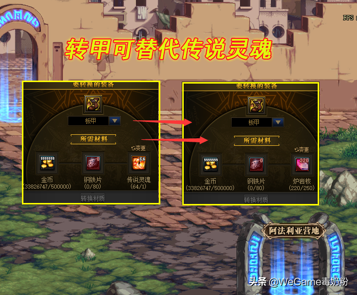 【3、转甲可替代传说灵魂】这是110级新增的设定,不少勇士根本不知道,“炉岩核”材料说明写着可用于转换材质,但很多玩家找不到,其实点一下“传说灵魂”上方的变更选项就可变换材料了,在开服初期极为有用,可用250个炉岩核替代1个传说灵魂,这么说吧。“奶系职业”最缺传说灵魂了!因为105史诗不转成板甲的话,buff量属性不生效,相当于白装。一直继承一直转甲,消耗量极高。