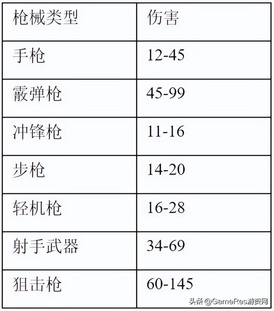 下表列出的是各种类型枪械的单发伤害,与DPS是相关的概念,但是可以看出单发伤害高的武器(霰弹枪、射手武器、狙击枪)DPS往往较低,这也是与枪械定位有关,近距离作战时子弹命中率高,因此DPS高的武器更占优势,而远距离下子弹命中率低,单发伤害高的武器命中时收益更大,通过这样确立各类型枪械适合作战的距离。而霰弹枪的优势是单发高伤害带来强大的斩杀能力,和通过掩体peek获得优势,因此虽然在近距离下DPS不如冲锋枪,但仍然是许多玩家会携带的武器。