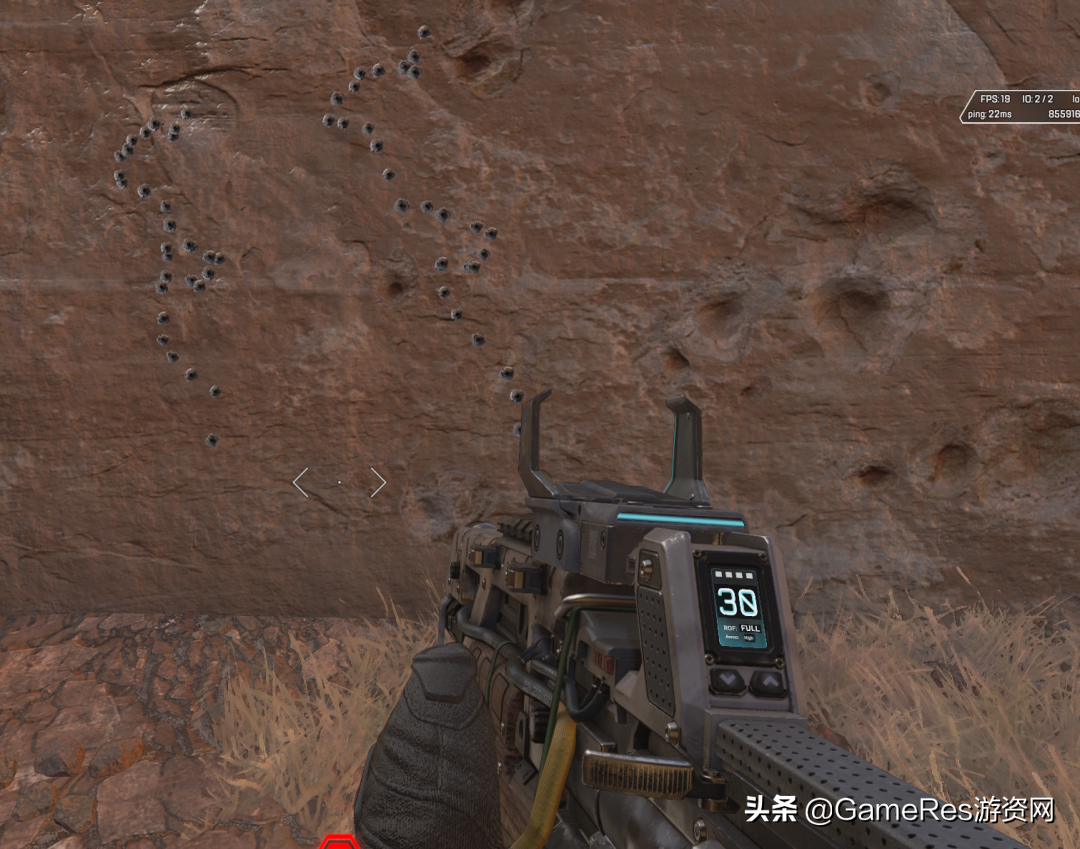 APEX中的枪械后坐力与其他射击游戏一样,分为垂直后坐力和水平后坐力,两方向后坐力都带有随机数值,但每次后坐力的趋势是相同的,下图中用平行步枪进行一个弹匣的开火,虽然子弹的落点不完全相同,但可以看到后坐力走势是一样的。