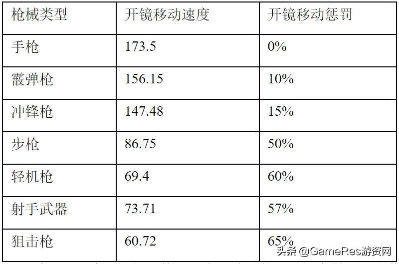 在使用不同类型的枪械时,有不同的移速惩罚,在近距离作战时移速是非常重要的属性,开镜移速慢的枪在对战开镜移速快的枪时,会被当靶子打,敌人在你面前快速移动,而你在敌人的视角里却移动的非常慢,下表是不同类型的枪械的开镜移速惩罚(角色默认持枪速度为173.5)。
