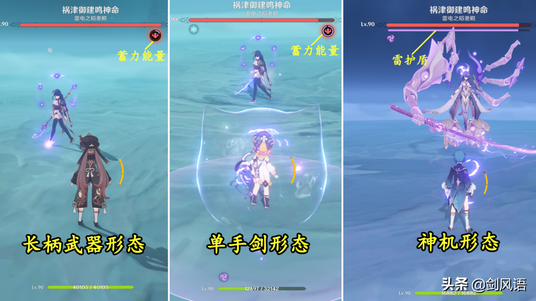 破雷盾后,20秒虚弱状态,如果还是没有击败雷神,那就会进入另一个形态,这三种形态,比如:开始是长柄武器形态,那能量蓄力满后进入神机形态,神机形态结束后,进入单手剑形态,以此循环。雷神副本只要了解机制,其实难度不大。