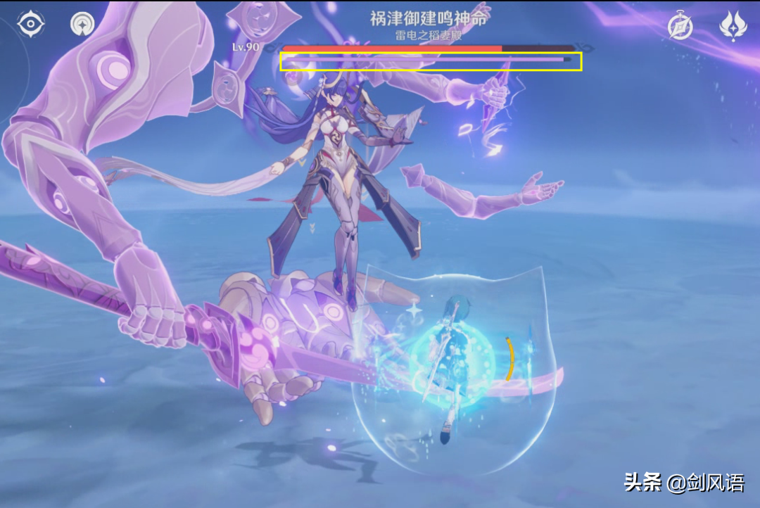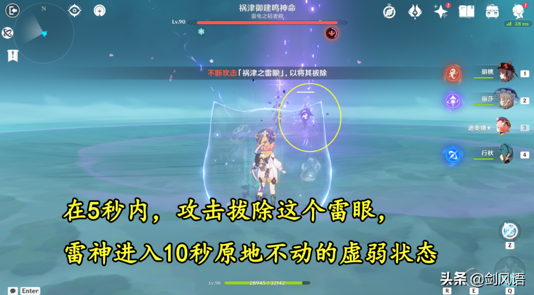 这个形态下,进入虚弱状态方法,如下图,雷神释放出「祸津之雷眼」,这个雷眼需要在5秒内,快速攻击破除,破除是按照攻击次数,与伤害高低和元素都无关,打掉后,雷神进入虚弱状态,原地不动10秒,随便你攻击。如你的角色强度够高,可以10秒内快速完成雷神副本。如10秒打不完,雷神会原地爆炸一下,记得提前开盾档。