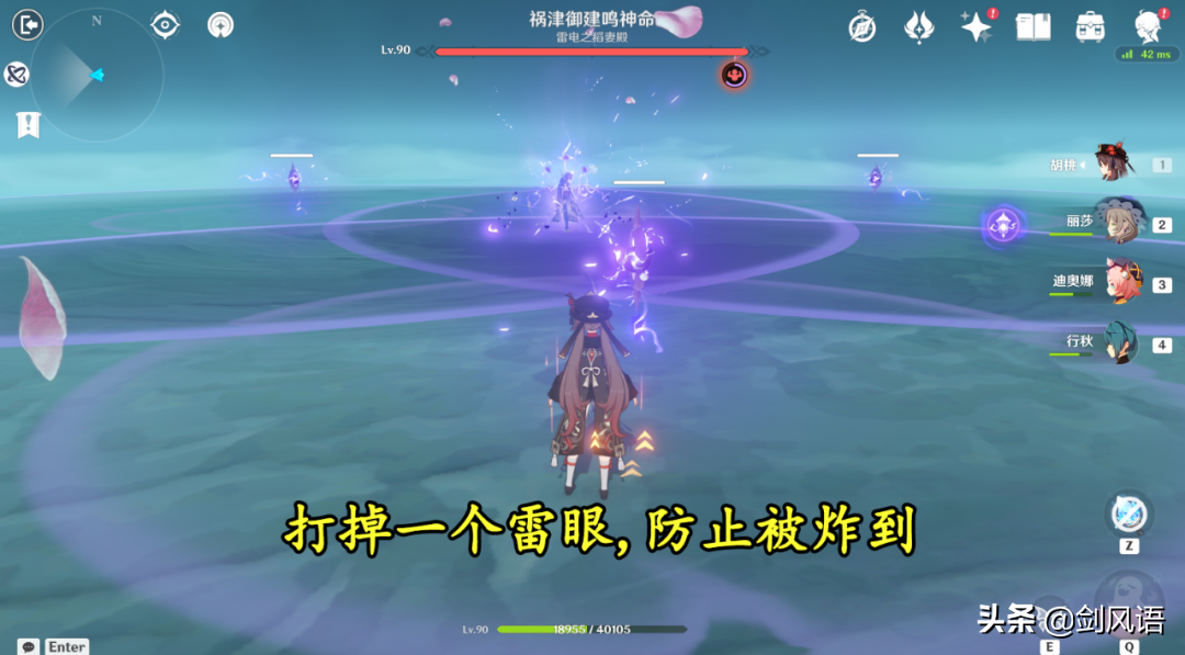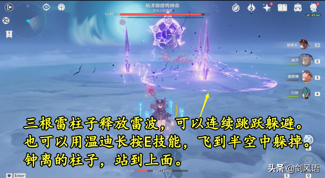 2.如下图,雷神周围插下3根雷针,雷针向周围发射雷冲击波,可以利用跳跃、温迪E风场、钟离的柱子,来躲避伤害。伤害很高,不建议开盾走近硬刚。
